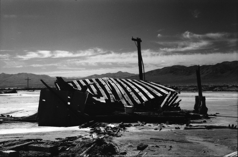 Drew: Will saw a giant white spot on the side of the road and said, ‘What’s that? Let’s go shoot there.’ It’s called Saltdale, California. It musta been a salt flat but it ain’t much now. You can still see all the geometry of industry, the organization, the thought … train tracks lead right into a shack that’s all shot up with bullet holes falling apart in the salt.